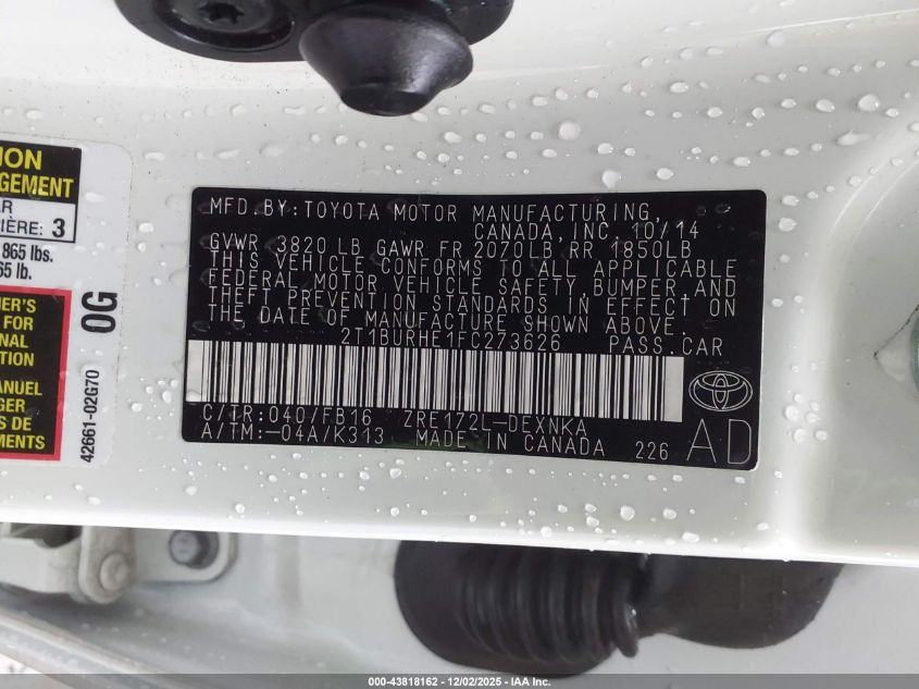 2015 TOYOTA COROLLA 2015 року Бензин, 1.8, Передній привід, vin - 2T1BURHE1FC273626 з США