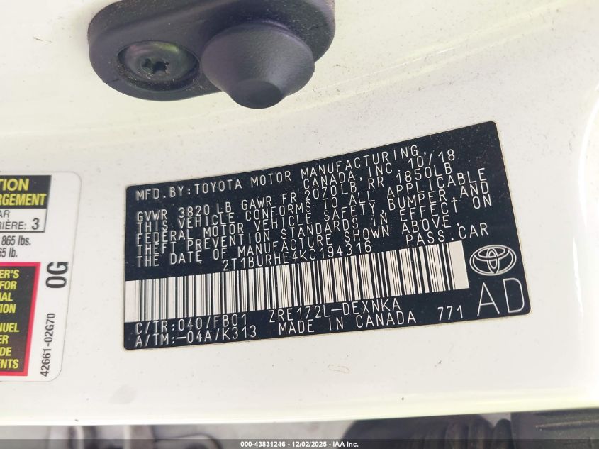 2019 TOYOTA COROLLA 2019 року Бензин, 1.8, Передній привід, vin - 2T1BURHE4KC194316 з США