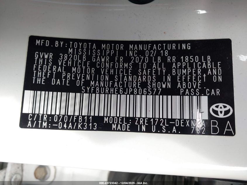 2018 TOYOTA COROLLA 2018 року Бензин, 1.8, Передній привід, vin - 5YFBURHE6JP806577 з США