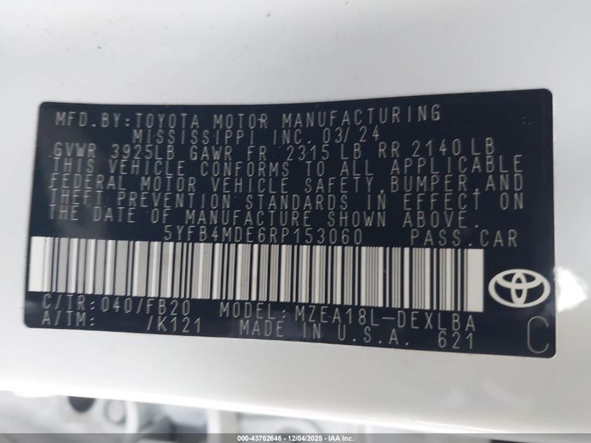 2024 TOYOTA COROLLA 2024 року Бензин, 2.0, Передній привід, vin - 5YFB4MDE6RP153060 з США