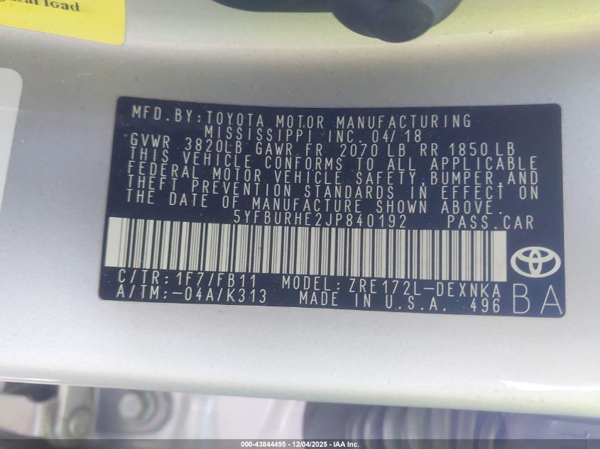 2018 TOYOTA COROLLA 2018 року Бензин, 1.8, Передній привід, vin - 5YFBURHE2JP840192 з США