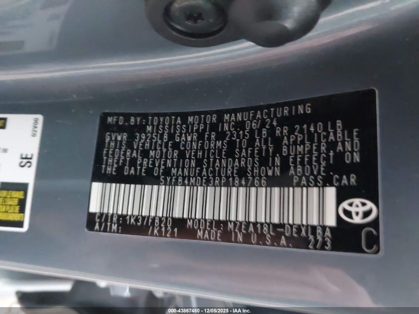 2024 TOYOTA COROLLA 2024 року Бензин, 2.0, Передній привід, vin - 5YFB4MDE3RP184766 з США