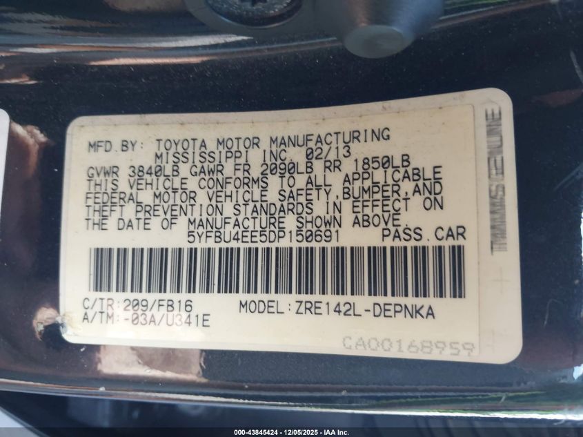 Колір ЧорнийЦиліндри 4Привід Передній привідVIN 5YFBU4EE5DP150691Стан СтаціонарноУшкодження З боків AutoRIA