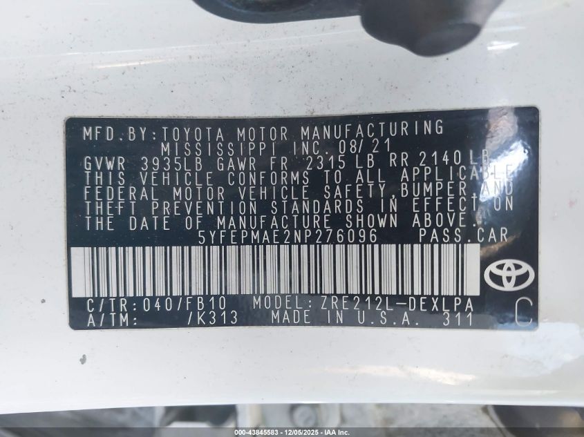 2022 TOYOTA COROLLA 2022 року Бензин, 1.8, Передній привід, vin - 5YFEPMAE2NP276096 з США