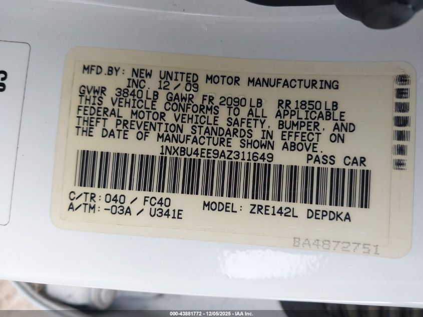 Колір БілийЦиліндри 4Привід Передній привідVIN 1NXBU4EE9AZ311649Стан Заводиться та їде (перевірено)Ушкодження Ліва сторона AutoRIA
