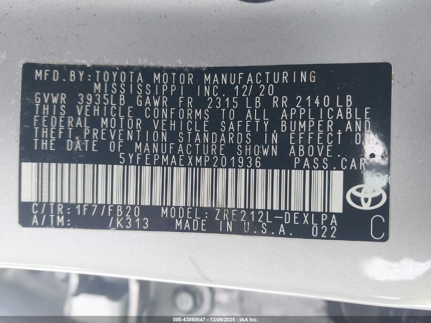 2021 TOYOTA COROLLA 2021 року Бензин, 1.8, Передній привід, vin - 5YFEPMAEXMP201936 з США