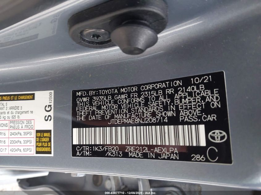 Колір СинійЦиліндри 4Привід Передній привідVIN JTDEPMAE8NJ208714Стан СтаціонарноУшкодження Передня або задня AutoRIA