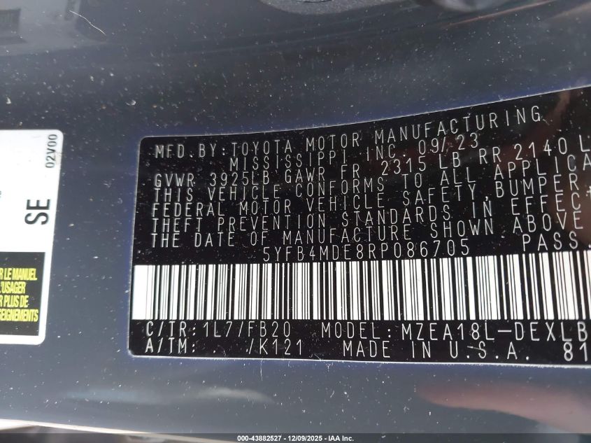 2024 TOYOTA COROLLA 2024 року Бензин, 2.0, Передній привід, vin - 5YFB4MDE8RP086705 з США