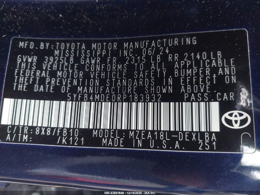 2024 TOYOTA COROLLA 2024 року Бензин, 2.0, Передній привід, vin - 5YFB4MDE0RP183932 з США