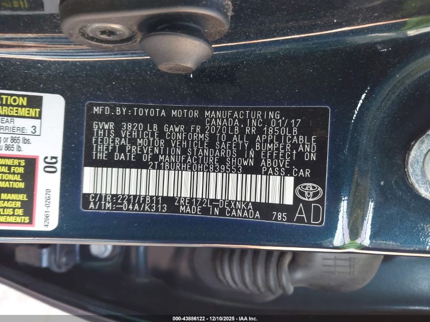 2017 TOYOTA COROLLA 2017 року Бензин, 1.8, Передній привід, vin - 2T1BURHE0HC839553 з США