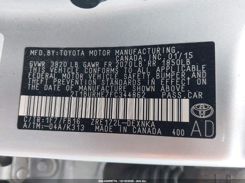 2015 TOYOTA COROLLA 2015 року Бензин, 1.8, Передній привід, vin - 2T1BURHE7FC344862 з США