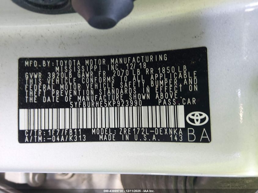 2019 TOYOTA COROLLA 2019 року Бензин, 1.8, Передній привід, vin - 5YFBURHE5KP923990 з США