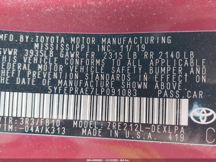 2020 TOYOTA COROLLA 2020 року Бензин, 1.8, Передній привід, vin - 5YFEPRAE7LP091083 з США