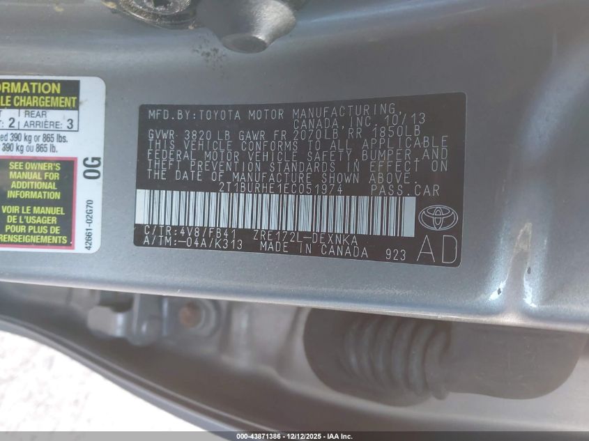 2014 TOYOTA COROLLA 2014 року Бензин, 1.8, Передній привід, vin - 2T1BURHE1EC051974 з США