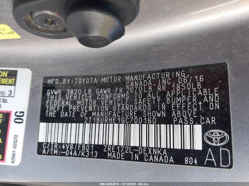2016 TOYOTA COROLLA 2016 року Бензин, 1.8, Передній привід, vin - 2T1BURHE1GC700160 з США