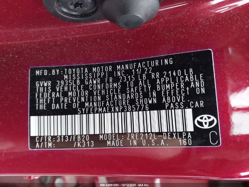 2022 TOYOTA COROLLA 2022 року Бензин, 1.8, Передній привід, vin - 5YFEPMAEXNP385776 з США