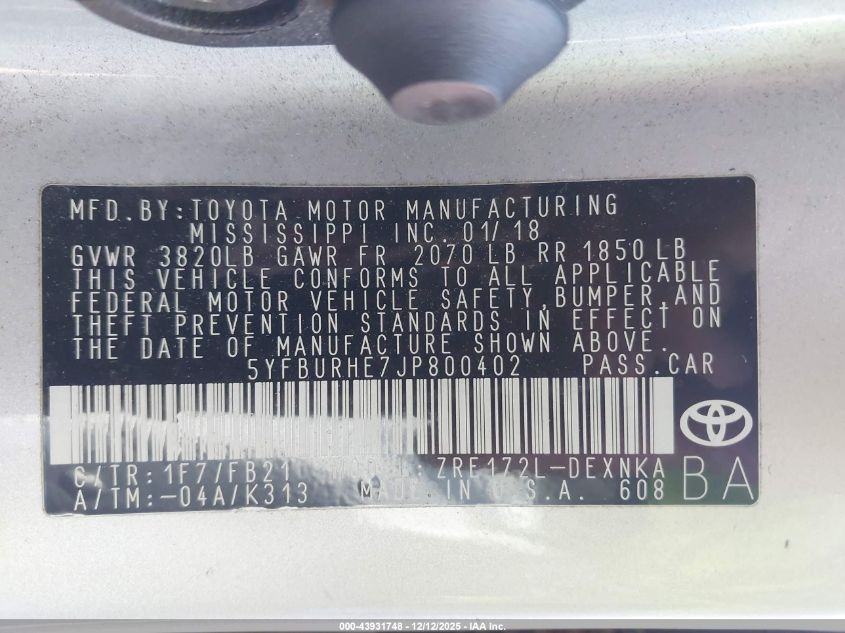 2018 TOYOTA COROLLA L