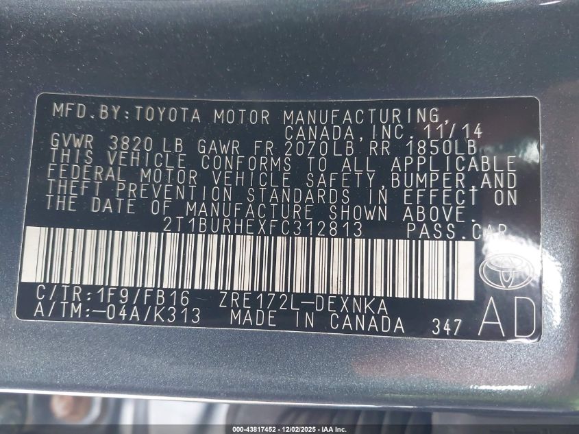 2015 TOYOTA COROLLA 2015 року Бензин, 1.8, Передній привід, vin - 2T1BURHEXFC312813 з США