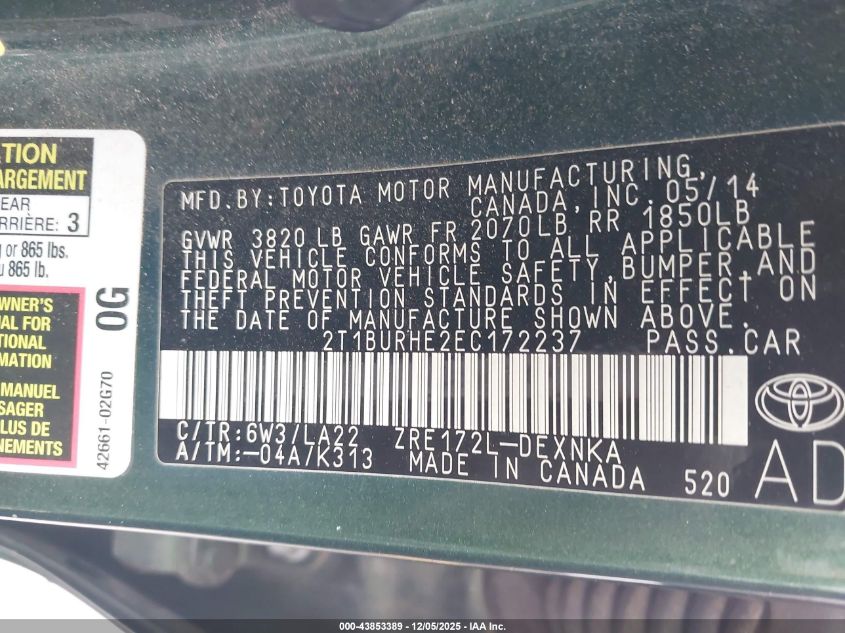 2014 TOYOTA COROLLA 2014 року Бензин, 1.8, Передній привід, vin - 2T1BURHE2EC172237 з США