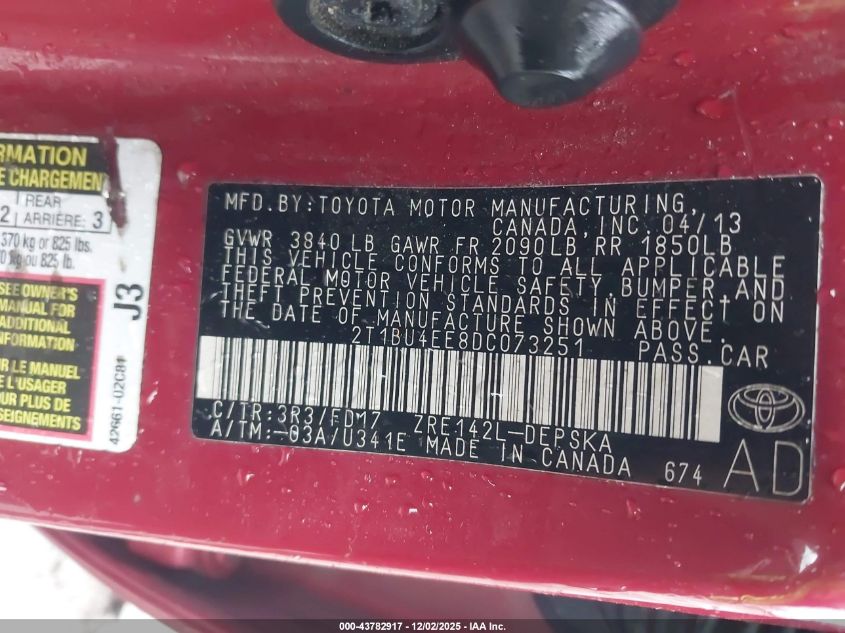 2013 TOYOTA COROLLA 2013 року Бензин, 1.8, Передній привід, vin - 2T1BU4EE8DC073251 з США