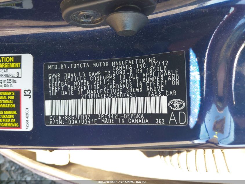 2012 TOYOTA COROLLA 2012 року Бензин, 1.8, Передній привід, vin - 2T1BU4EE9CC907431 з США