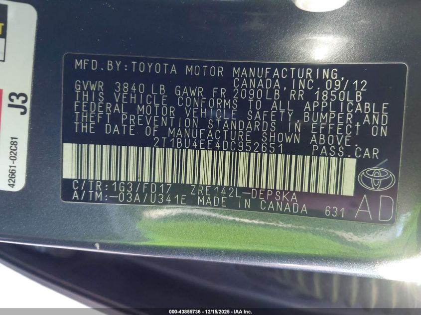 2013 TOYOTA COROLLA 2013 року Бензин, 1.8, Передній привід, vin - 2T1BU4EE4DC952651 з США