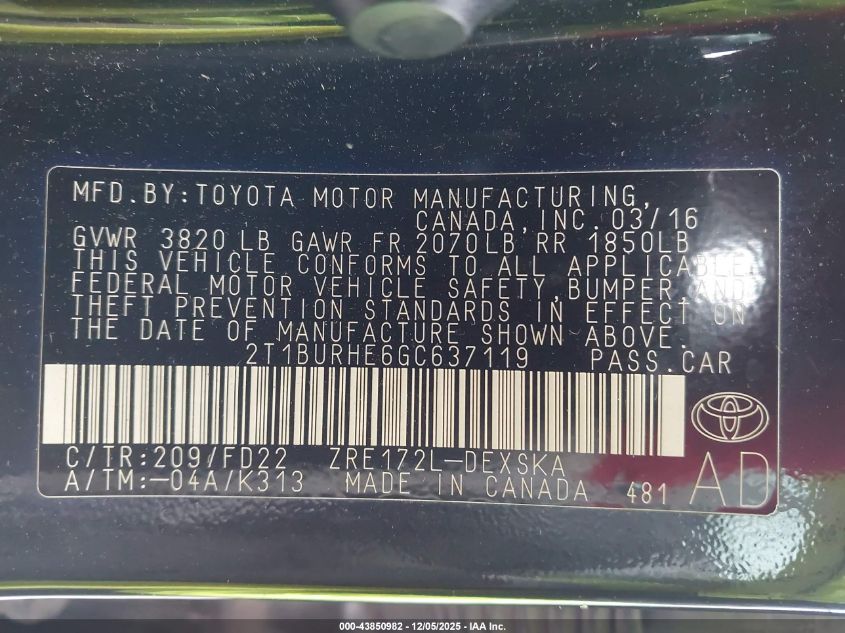 2016 TOYOTA COROLLA L