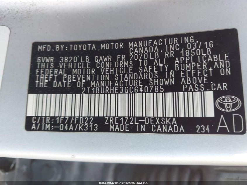 2016 TOYOTA COROLLA L