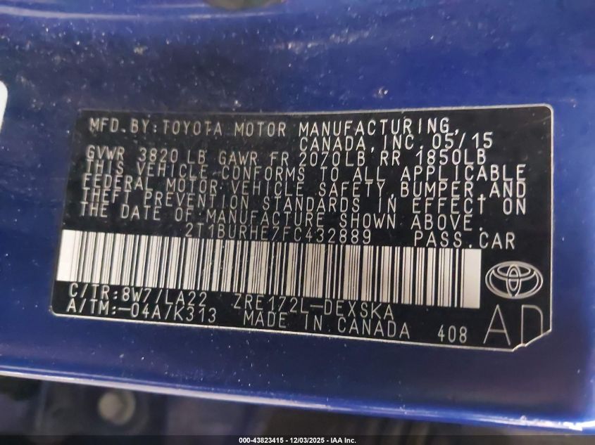 2015 TOYOTA COROLLA 2015 року Бензин, 1.8, Передній привід, vin - 2T1BURHE7FC432889 з США