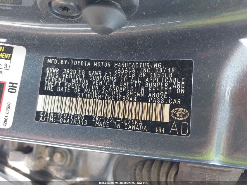 2019 TOYOTA COROLLA 2019 року Бензин, 1.8, Передній привід, vin - 2T1BURHE6KC158949 з США