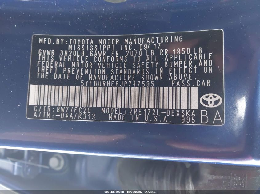 2018 TOYOTA COROLLA 2018 року Бензин, 1.8, Передній привід, vin - 5YFBURHE8JP747595 з США