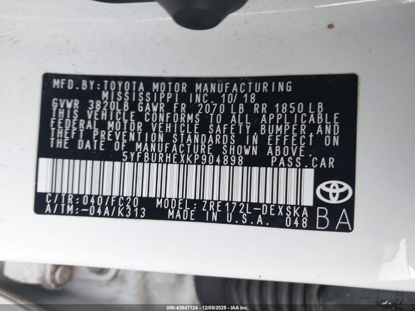 2019 TOYOTA COROLLA 2019 року Бензин, 1.8, Передній привід, vin - 5YFBURHEXKP904898 з США