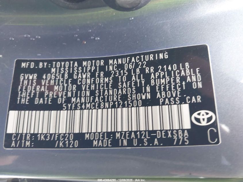 2022 TOYOTA COROLLA 2022 року Бензин, 2.0, Передній привід, vin - 5YFS4MCE8NP121500 з США