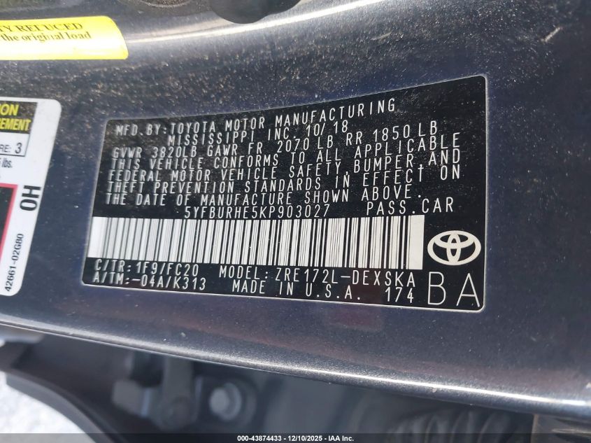 2019 TOYOTA COROLLA 2019 року Бензин, 1.8, Передній привід, vin - 5YFBURHE5KP903027 з США
