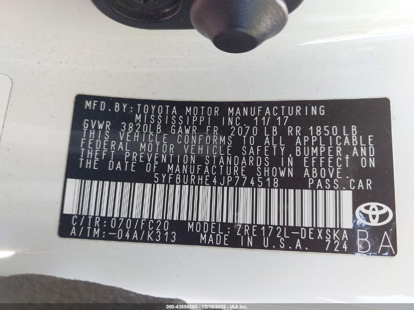2018 TOYOTA COROLLA 2018 року Бензин, 1.8, Передній привід, vin - 5YFBURHE4JP774518 з США
