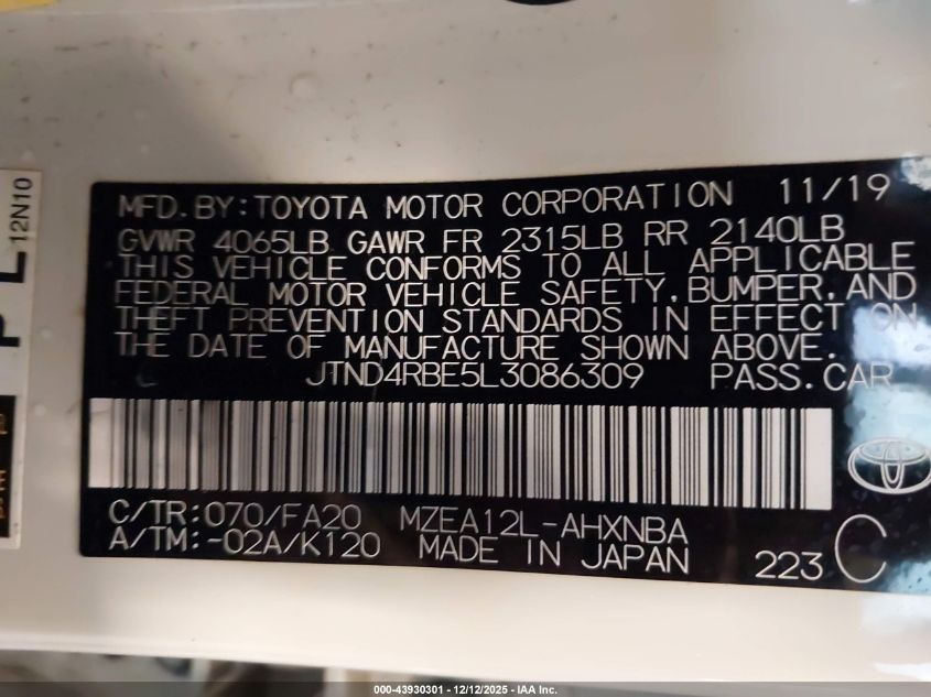 2020 TOYOTA COROLLA 2020 року Бензин, 2.0, Передній привід, vin - JTND4RBE5L3086309 з США