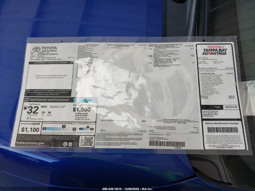 2022 TOYOTA COROLLA 2022 року Бензин, 2.0, Передній привід, vin - JTDM4MCE7NJ084324 з США