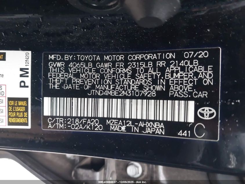 2021 TOYOTA COROLLA 2021 року Бензин, 2.0, Передній привід, vin - JTND4MBE2M3107928 з США