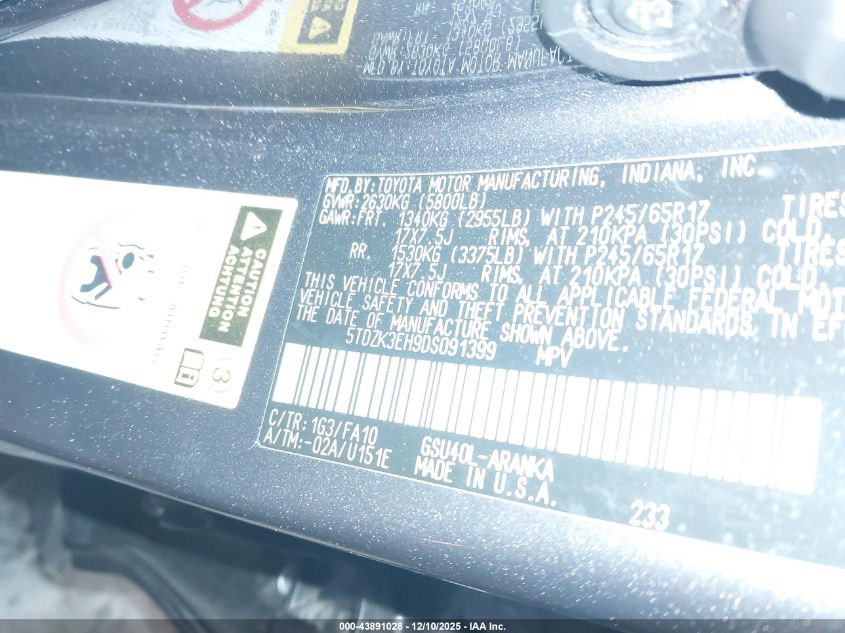 Колір СірийЦиліндри 6Привід Передній привідVIN 5TDZK3EH9DS091399Стан Заводиться та їде (перевірено)Ушкодження Передня або задня AutoRIA