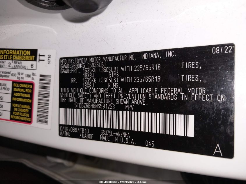 Колір БілийЦиліндри 6Привід Повний привідVIN 5TDBZRBH8NS591253Стан Заводиться та їде (перевірено)Ушкодження Передня або задня AutoRIA