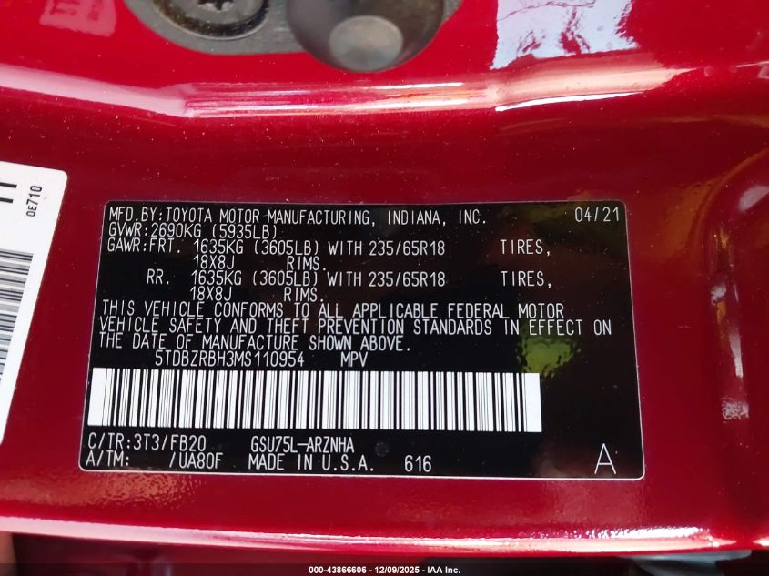 2021 TOYOTA HIGHLANDER 2021 року Бензин, 3.5, Повний привід, vin - 5TDBZRBH3MS110954 з США
