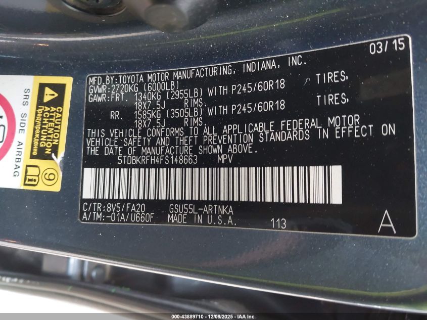 2015 TOYOTA HIGHLANDER 2015 року Бензин, 3.5, Повний привід, vin - 5TDBKRFH4FS148663 з США