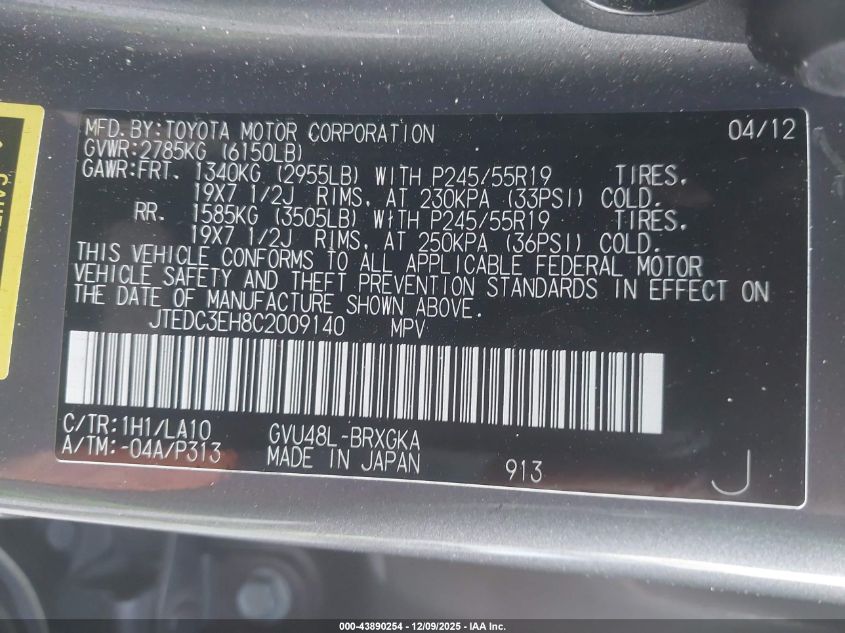 Колір СірийЦиліндри 6Привід Повний привідVIN JTEDC3EH8C2009140Стан СтаціонарноУшкодження Передня і задня AutoRIA