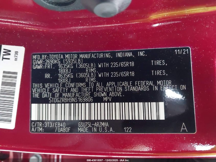 2022 TOYOTA HIGHLANDER 2022 року Бензин, 3.5, Повний привід, vin - 5TDGZRBH9NS169806 з США