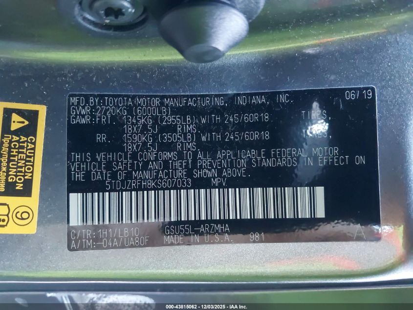 2019 TOYOTA HIGHLANDER 2019 року Бензин, 3.5, Повний привід, vin - 5TDJZRFH8KS607033 з США