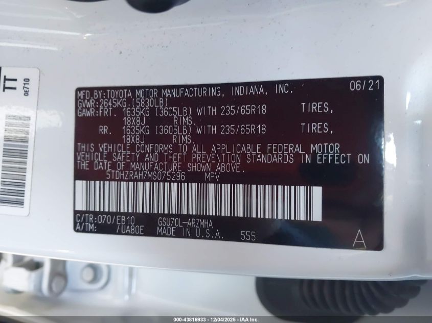 2021 TOYOTA HIGHLANDER 2021 року Бензин, 3.5, Передній привід, vin - 5TDHZRAH7MS075296 з США