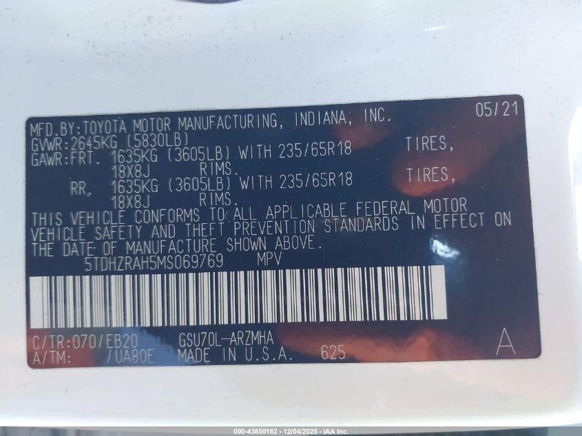 2021 TOYOTA HIGHLANDER 2021 року Бензин, 3.5, Передній привід, vin - 5TDHZRAH5MS069769 з США