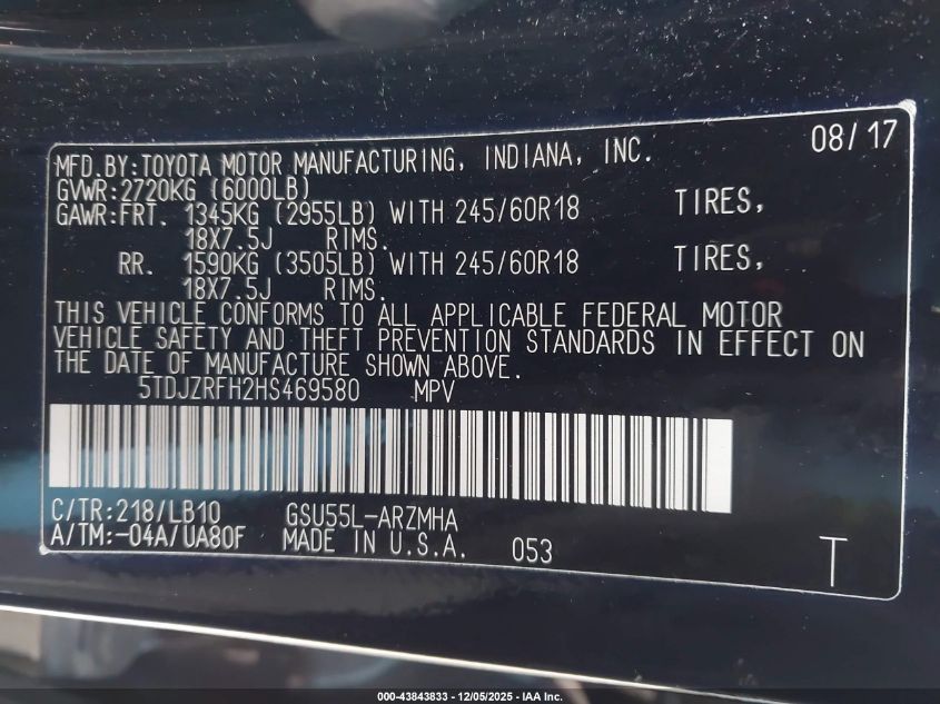 2017 TOYOTA HIGHLANDER 2017 року Бензин, 3.5, Повний привід, vin - 5TDJZRFH2HS469580 з США