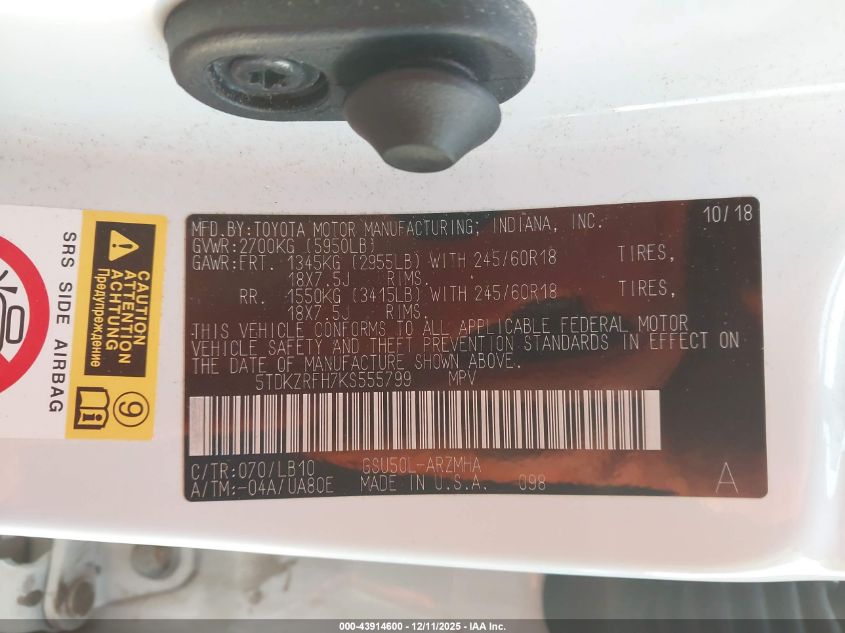 2019 TOYOTA HIGHLANDER 2019 року Бензин, 3.5, Передній привід, vin - 5TDKZRFH7KS555799 з США