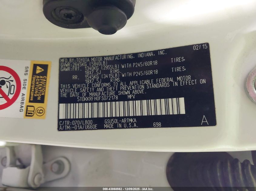 2015 TOYOTA HIGHLANDER 2015 року Бензин, 3.5, Передній привід, vin - 5TDKKRFH0FS072178 з США